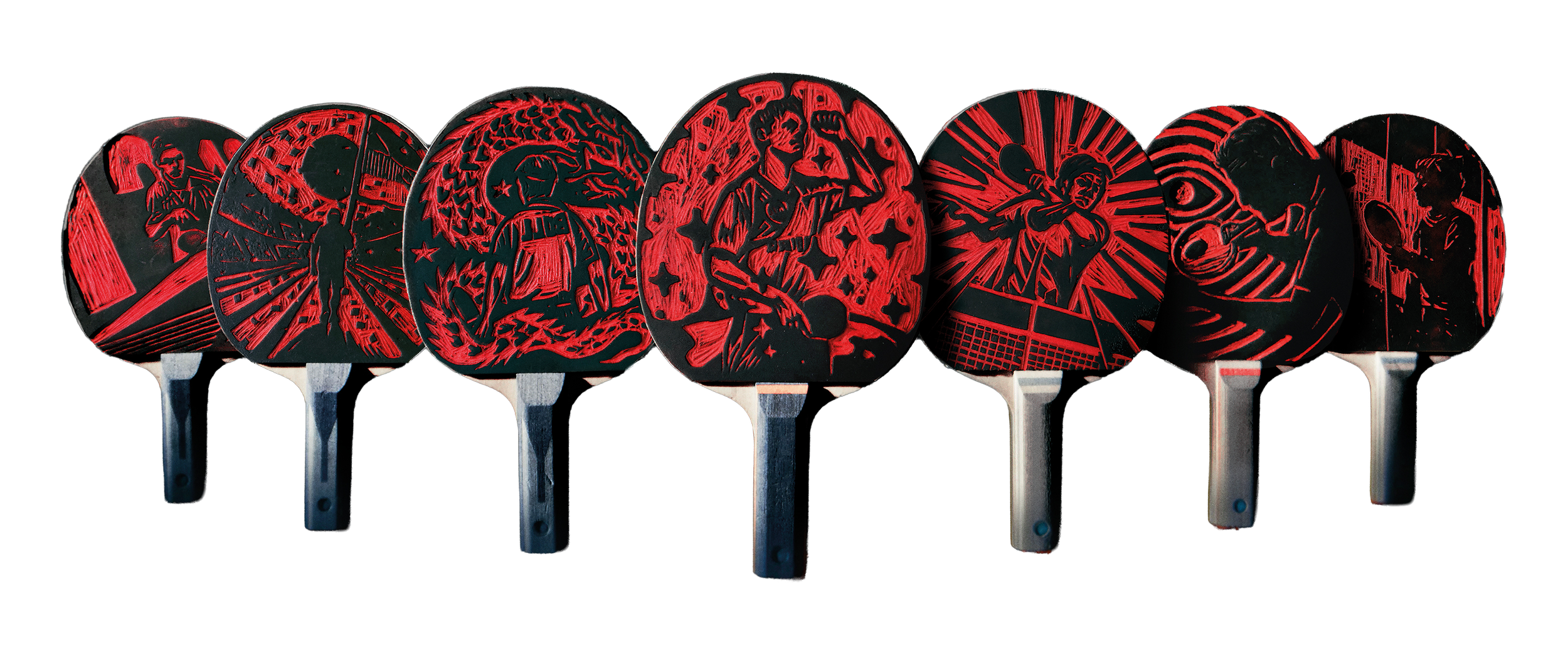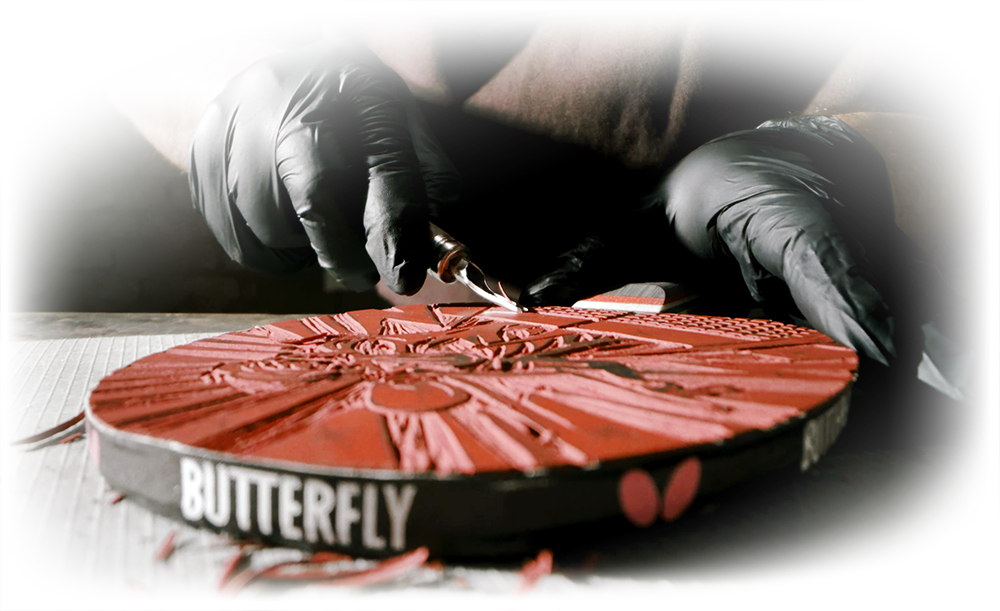 Acht Original Butterfly Tischtennisschläger, acht Kunstwerke aus Linolschnitt. Die Versteigerung ausgewählter Einzelstücke ist beendet. Der Erlös geht an die Förderung junger Tischtennistalente:
