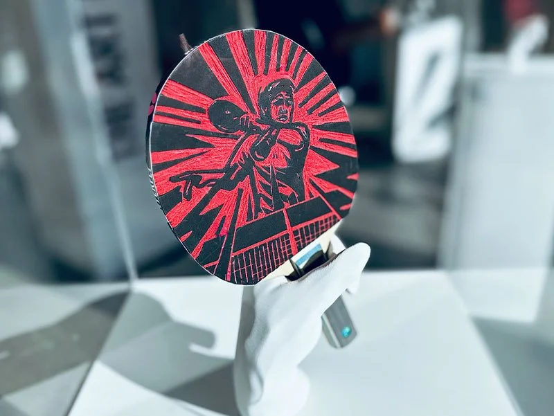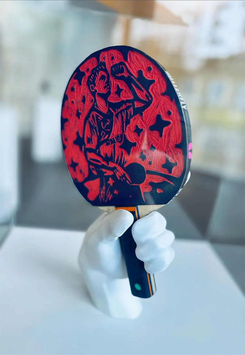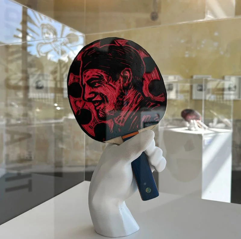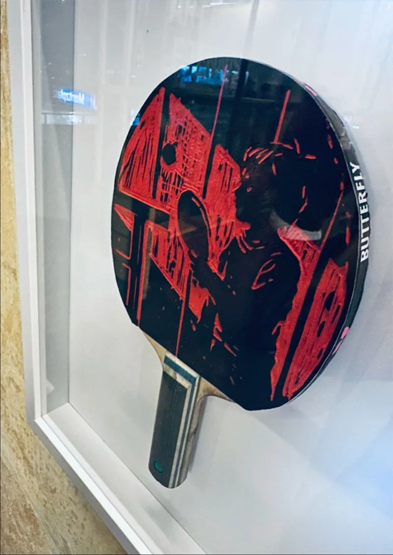 We transformed Butterfly Timo Boll rackets into linoleum print works of art. Each racket tells a defining moment of his career.